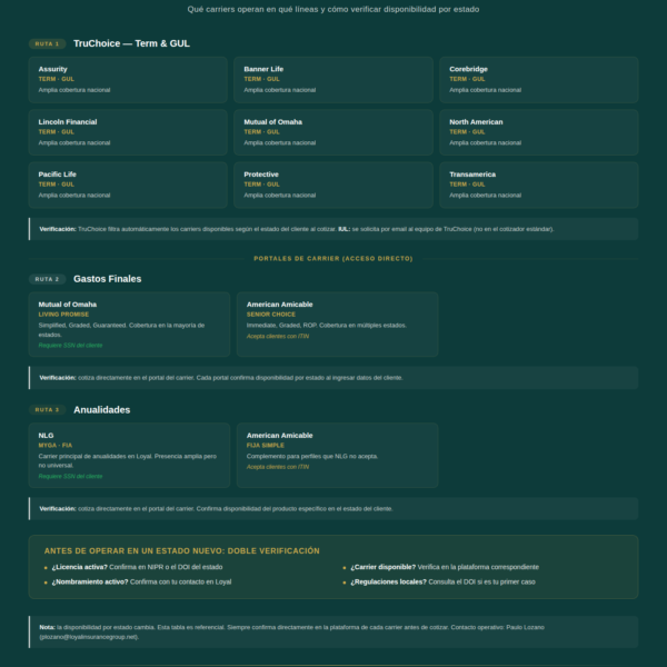 Tener licencia en un estado es el primer paso. Pero no basta. También necesitas confirmar que los carriers con los que trabajas operen en ese estado. Porque si tienes licencia en Ohio pero tu carrier principal no tiene productos disponibles ahí, la licencia no te sirve de mucho.