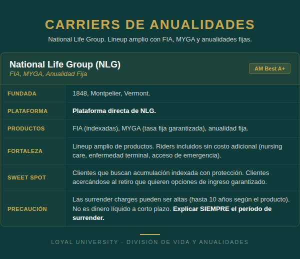 El lineup de anualidades de Loyal es más simple que el de vida. Son dos carriers que ya conoces: NLG (National Life Group) y American Amicable.