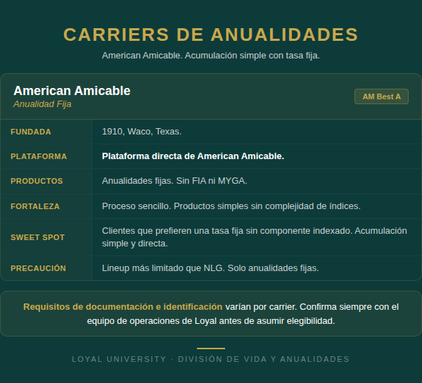 Ya lo conoces del Módulo 3 como carrier de gastos finales. En anualidades, American Amicable ofrece productos más simples enfocados en acumulación con tasa fija.