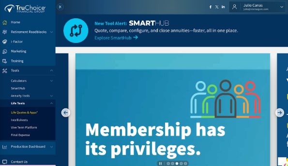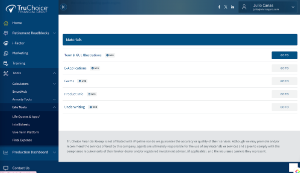 Desde el tablero o dashboard principal de TruChoice, selecciona en el menú lateral izquierdo la opción Tools (Herramientas) y luego haz clic en Life Tools / Life Quotes & Apps*.
