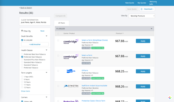 Supongamos que quieres cotizar una póliza a término para el Sr. Juan Pérez, residente en Florida, nacido el 1 de octubre de 1984, por $1 millón a 20 años, quien no fuma y alega tener buena salud.